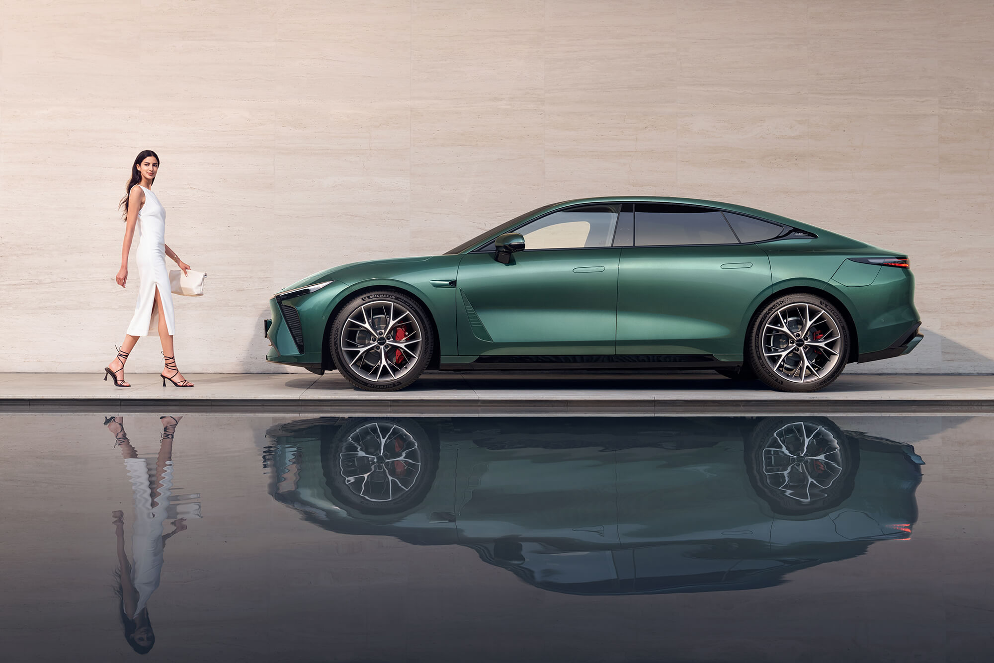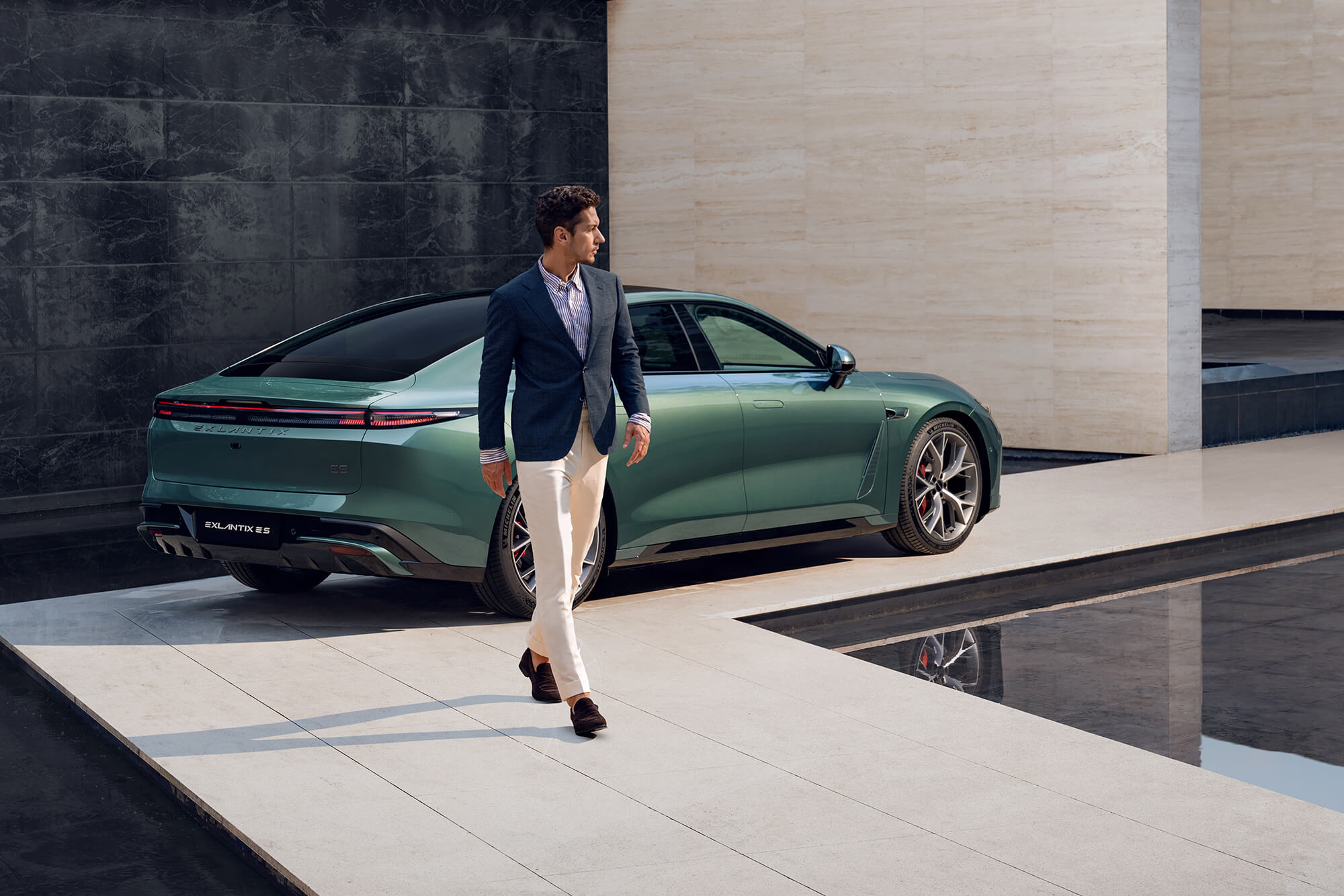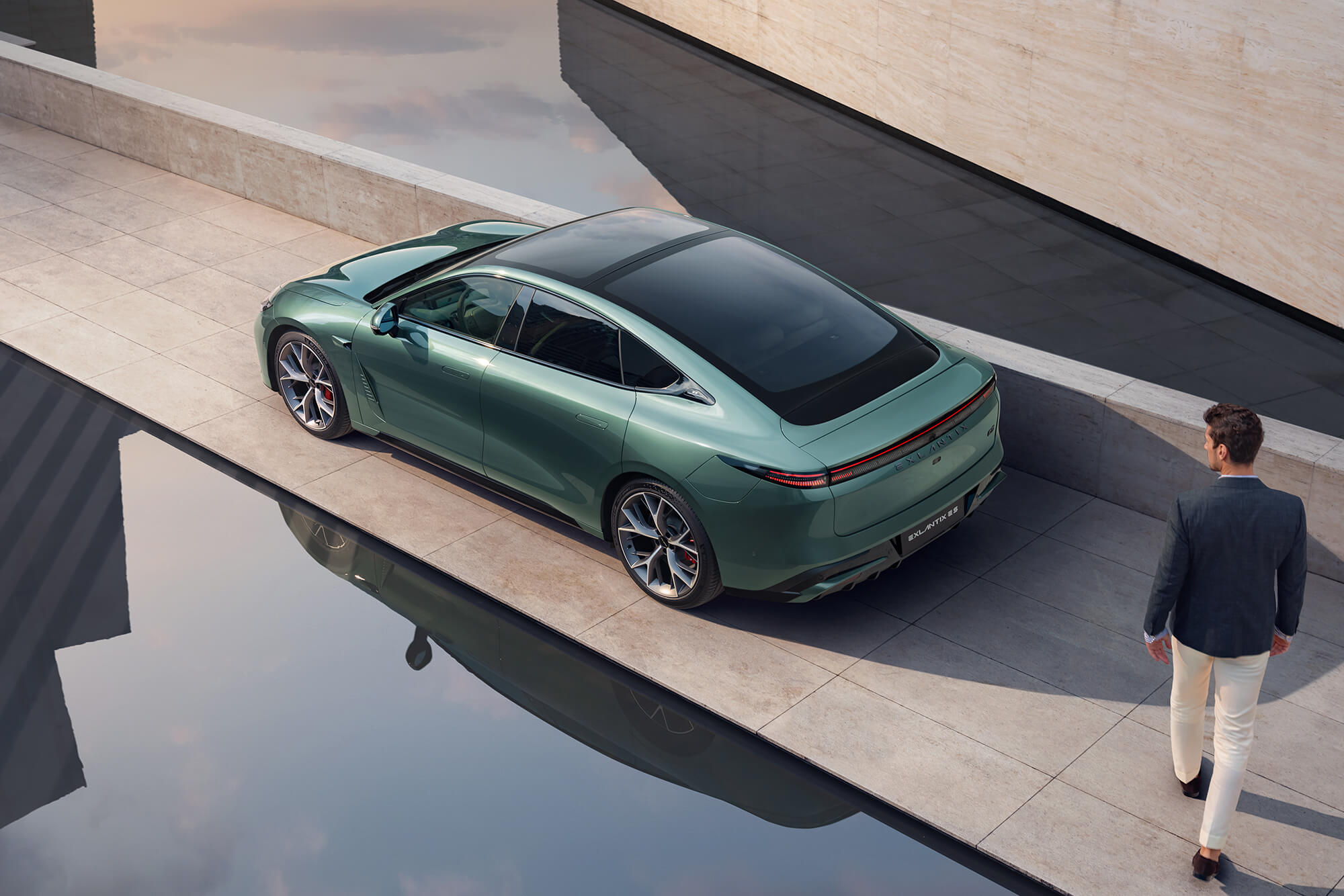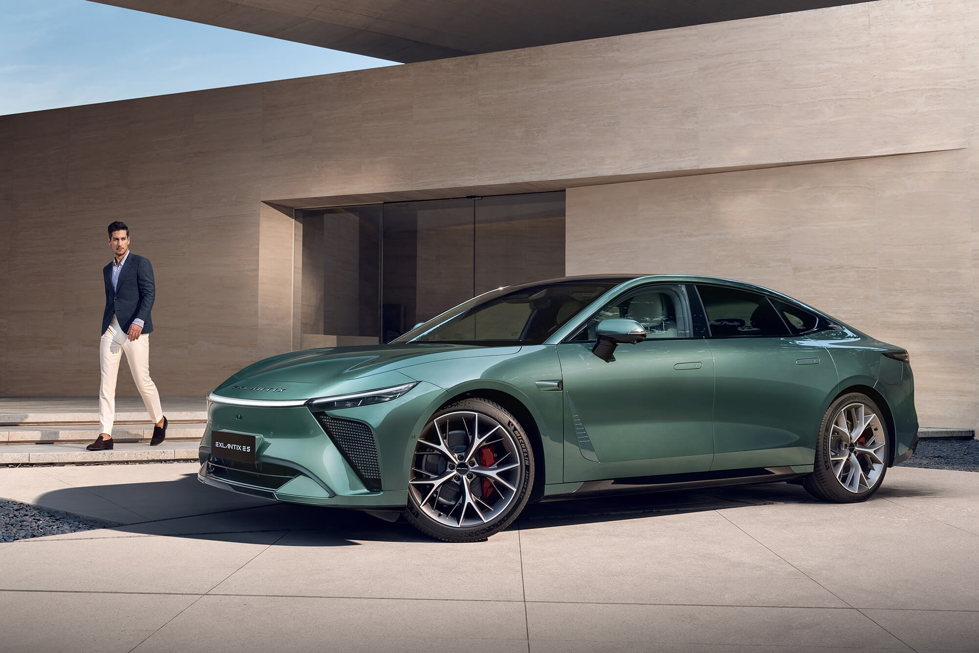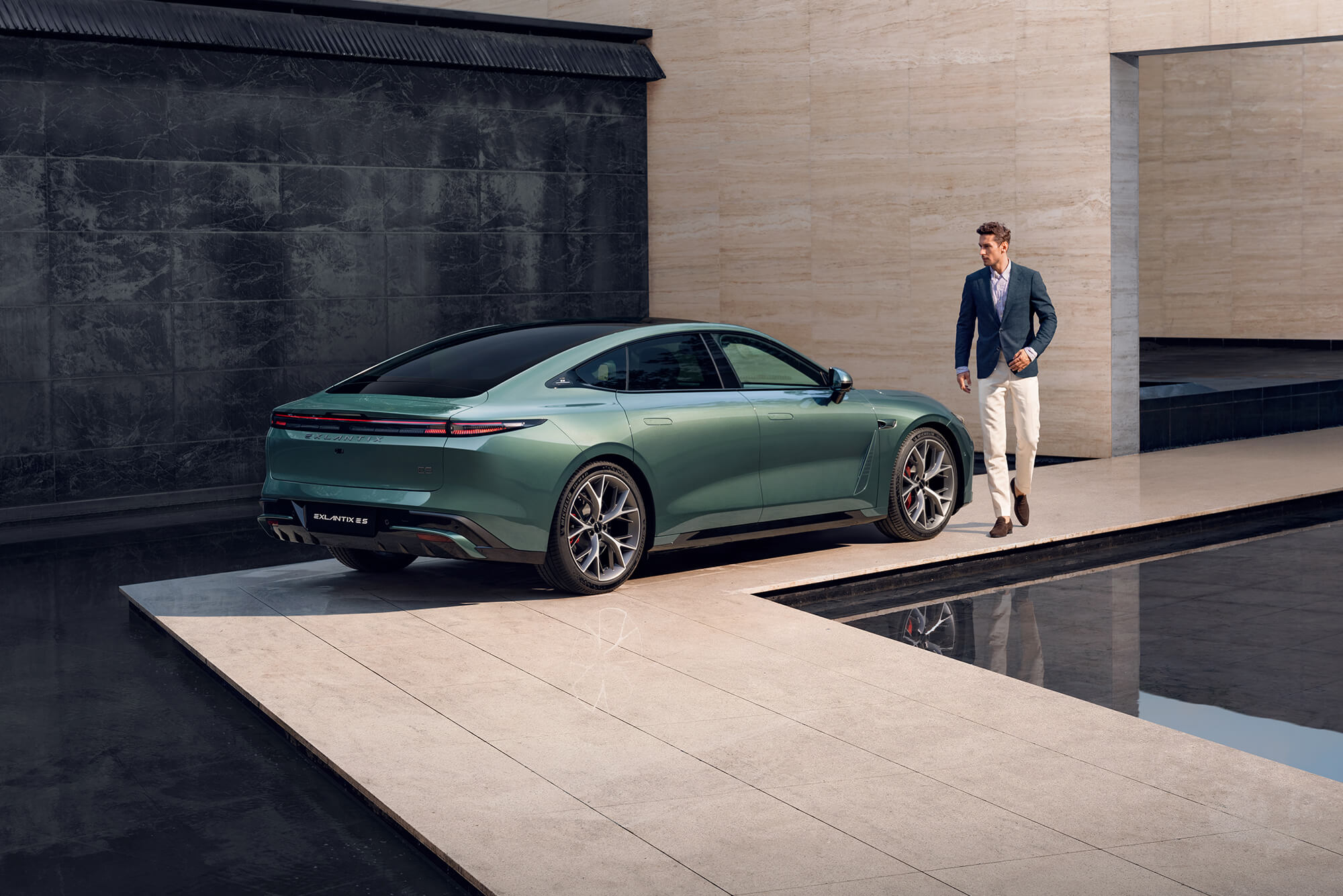Exlantix ES glider gennem luften med uovertruffen lethed. De gennemgående baglygter og de skjulte dørhåndtag indgår i et aerodynamisk design, hvor hver detalje er skabt med fokus på effektivitet og elegance.